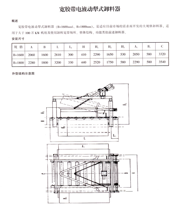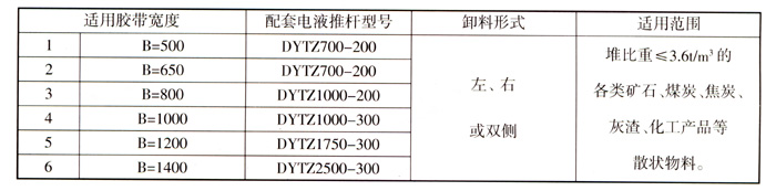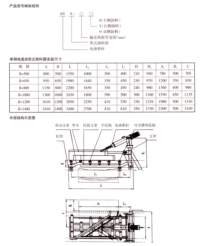 DYN-IV型電液動(dòng)犁式卸料器,是我公司和電力部中南電力設(shè)計(jì)院聯(lián)合開發(fā)的產(chǎn)品之一,是安裝在膠帶輸送機(jī)上執(zhí)行卸料及控制物料輸送流量、流向的機(jī)械配套產(chǎn)品,可直接安裝在膠帶輸送機(jī)的中間架上,能將膠帶輸送的物料在中途均勻、連續(xù)地卸入漏斗(料斗)中,或卸到需要的場(chǎng)所去。