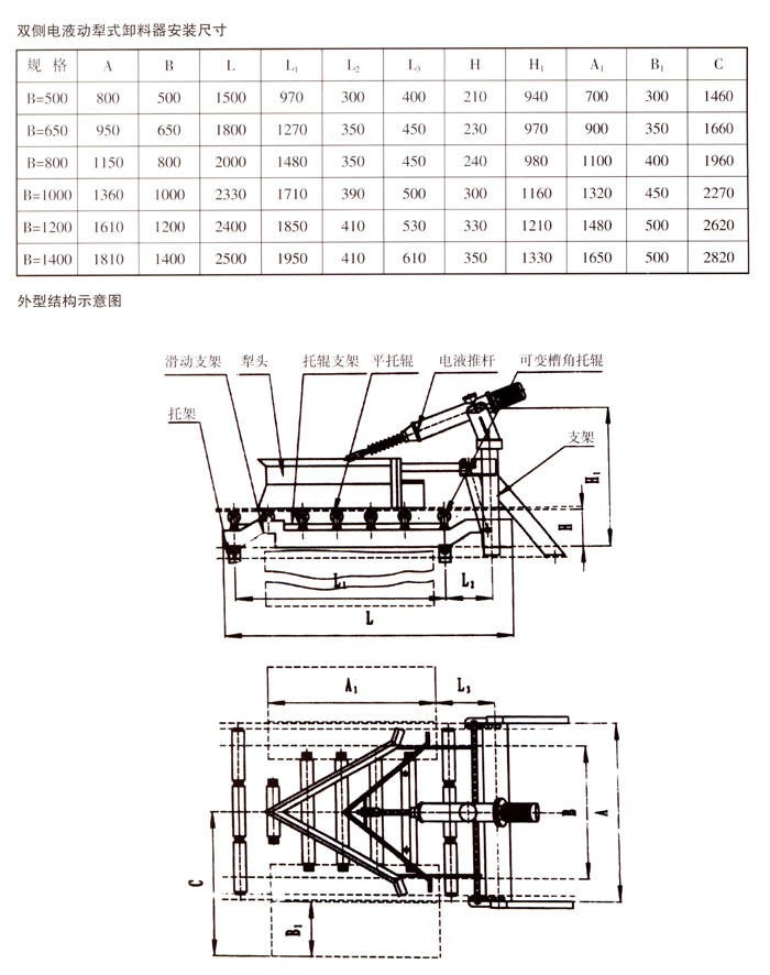 電液動(dòng)犁式卸料器以電液推桿為動(dòng)力源,工作時(shí),通過(guò)推桿伸出作用于驅(qū)動(dòng)桿、帶動(dòng)框架前進(jìn),完成犁刀下落,并支承起平托輥組,使膠帶工作面平直,犁刀下沿與膠帶面貼合緊密,將運(yùn)行膠帶上物料卸入漏斗(料斗)中,或卸到需要的場(chǎng)所去。卸料完畢時(shí),啟動(dòng)推桿縮回作用于驅(qū)動(dòng)桿,帶動(dòng)框架后退、犁刀上抬、可變槽角托輥組由平形變回槽形,使膠帶工作面恢復(fù)槽形狀態(tài),讓物料平穩(wěn)通過(guò)。